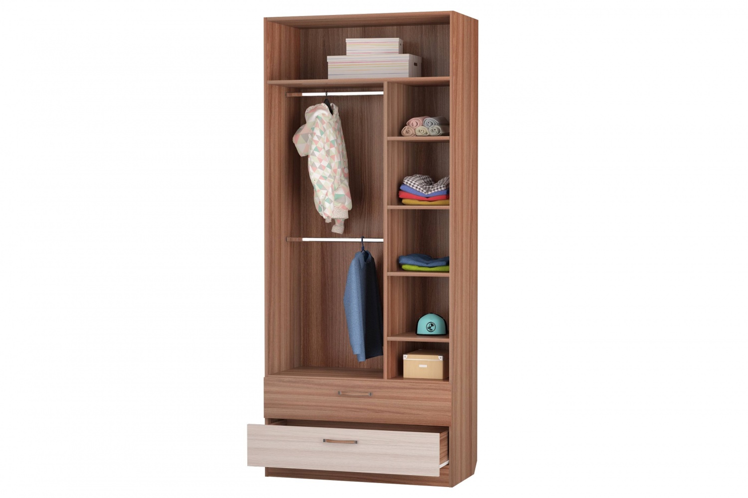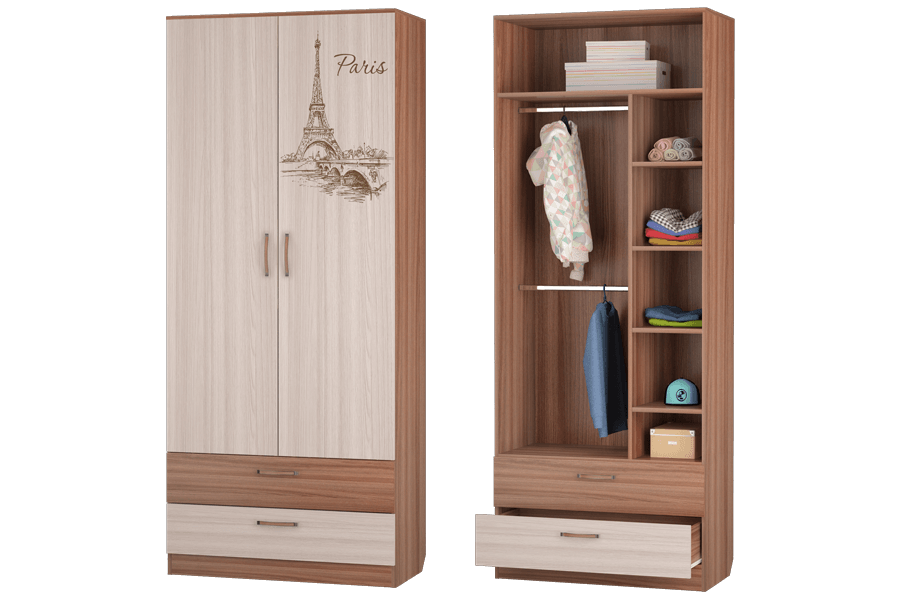 Кромка ПВХ – 0,4мм/1мм в цвет деталей, ручки пластмассовые со вставкой ясень темный – 128мм. Направляющие – роликовые.